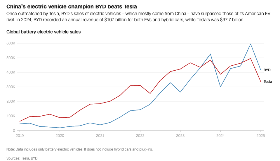 Inside China’s borders, a cutthroat price war among dozens of EV firms has driven relentless innovation. Companies like CATL and BYD are trading punches with breakthroughs like 5-minute charging batteries that offer over 300 miles of range. Firms are racing to integrate autonomous driving tech, luxury-grade interiors, and next-gen infotainment into cars that sell for under $30,000. It’s the kind of market pressure that breeds not just affordability, but excellence.
